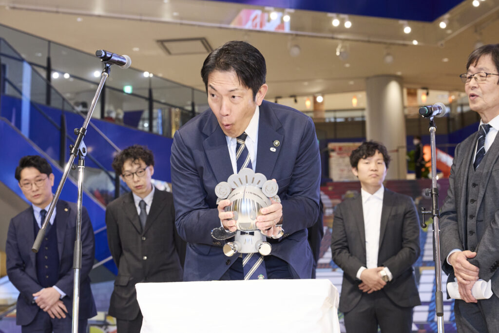 市長もメタルマッキーの重さにびっくりしていました。そらそう、20kgもあるもんな(笑)